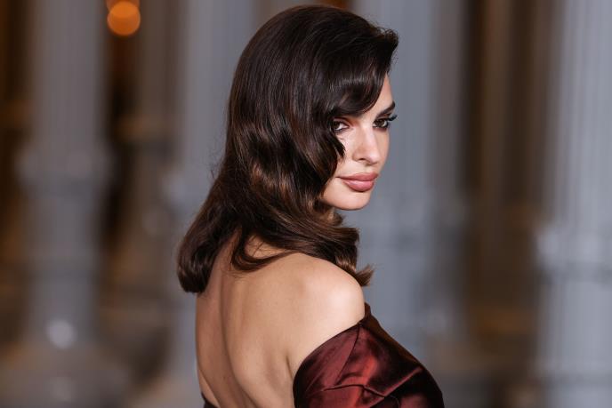 Atraktivna Emili blistala je u dugoj haljini u najpopularnijij boji ove sezone - bordo. Glamurozna toaleta bila je u kombinaciji dva materijala - do pola je bila svilena, a od kukova do kraja dužine plišana.