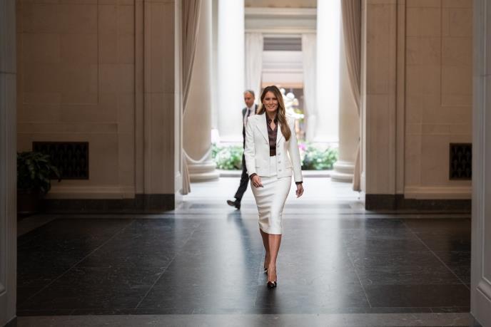 Za ovu priliku je Melanija Tramp nosila vuneni sako boje slonovače i visoko strukiranu 'pencil' suknju koja je imala šlic pozadi, brenda Dolce & Gabbana. Kada je reč o košulji, ona je bila čokoladno-smeđa i istog je brenda, a čije su manžetne virile iz rukava. Kaiš je bio brenda Ralph Lauren, a cipele na štiklu Manolo Blahnik.
