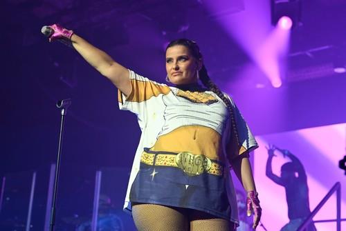Na bini u Mančesteru, 46-godišnja zvezda pojavila se u predimenzioniranoj, beloj majici s printom ženskog tela, čime je stvorila optičku iluziju svoje figure ― na majici je prikazana žena u belom krop-topu, s brushalterom koji se nazire, i niskom suknjom s velikom kopčom "Whoa Nelly".