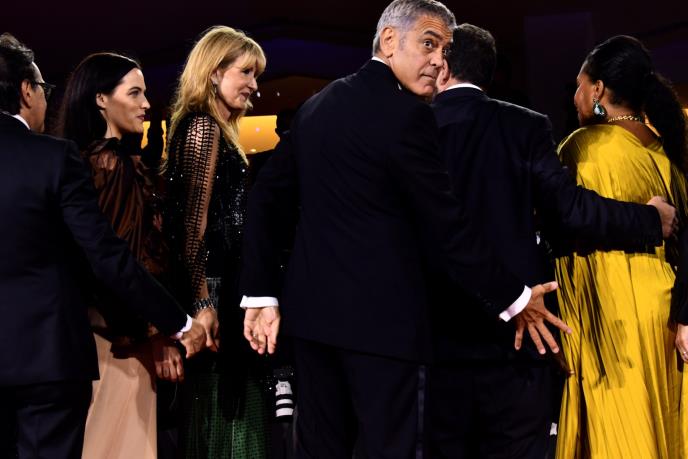 Kluni je pokušavao da se našali sa fotografima koji su se našli u pozadini ekipe filma koja je pozirala njihovim kolegama sa druge strane crvenog tepiha.