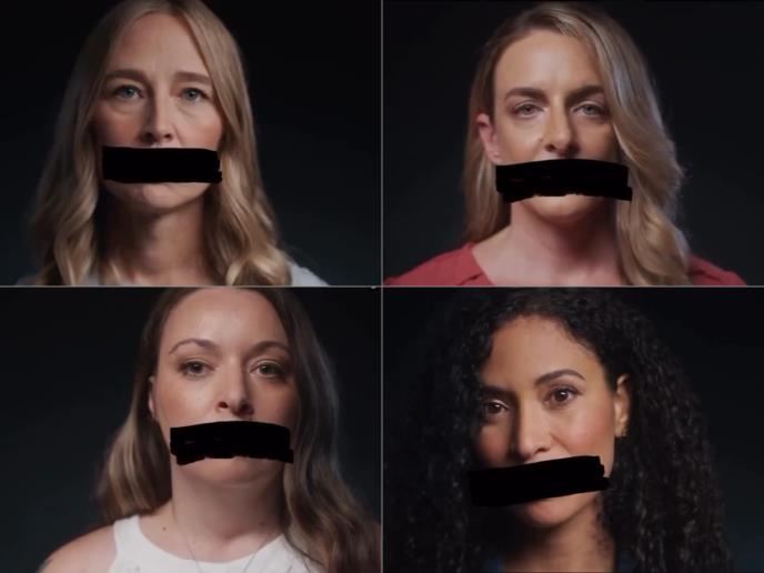 Crna traka za cenzuru zatim je postavljena preko usta Epstajnovih preživelih žrtava u reklami, pre nego što se spot završio očajničkim apelom upućenim Amerikancima.