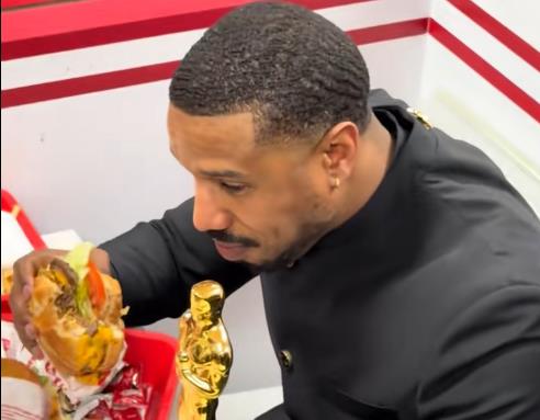 Snimci koje su se ubrzo pojavili na društvenim mrežama prikazuju Džordana kako u elegantnom crnom odelu sedi za stolom u restoranu i uživa u hamburgeru i pomfritu, dok je zlatnu statuetu Oskara stavio tik pored platoa s hranom.