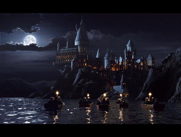 Na slici se mladi čarobnjak Hari vidi s leđa u Hogvortsu (Dominik Meklaflin) dok prilazi terenu za kvidič u grifindorskom ogrtaču i sa metlom u ruci, po snežnom danu, dok se u pozadini vide i drugi učenici.