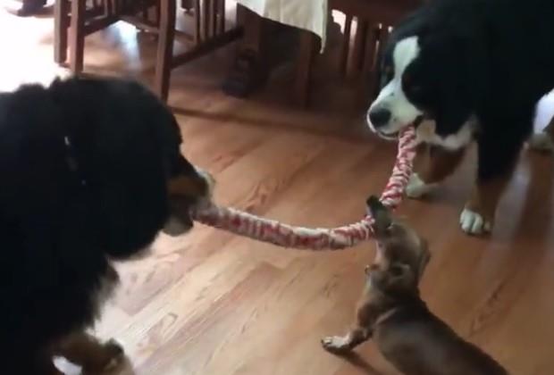Source: Tiny Dachshund wins epic tug-of-war battle against two Bernese Mountain dogs by biffy101 on Rumble