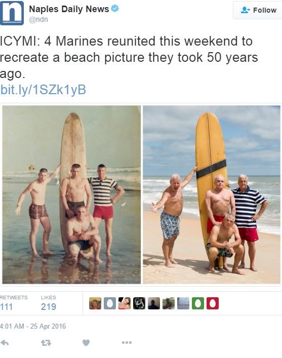 Četiri starija muškaraca na plaži na Floridi okupili su se da bi oživeli svoje uspomene i napravili novu fotografiju, istu onakvu kakvu su napravili pre 50 godina, pre nego što su otišli u Vijetnam.