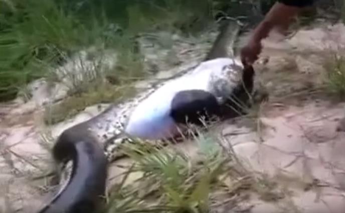 Anakonde spadaju u najopasnije zmije na svetu, pa je reakcija ovih ljudi koji su na nju naleteli vrlo opravdana. Kako su se približavali, shvatili su da je zmija mrtva. Najverovatniji uzrok smrti jeste to što se zmija prejela. Jedan iz grupe sa sobom je poneo mačetu pa je zasekao po stomaku zmije.