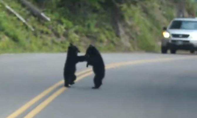 Svi vozači izvadili su telefone i snimali neverovatan prizor. Nasred puta, na duploj punoj liniji igrala su se dva malena crna medvedića. Nikome nije padalo na pamet da ih skloni, već su uživali u igri predivnih stvorenja.