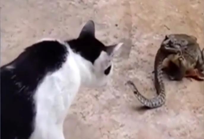 Sučeljavanje mačke sa zmijom koju upravo proždire žaba verovatno nije nešto što bi vam ikada palo na pamet, ali internet ne predstavlja da nas iznenađuje.
