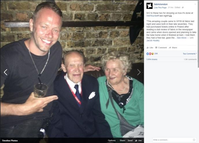 "Ovaj neverovatni par došao je na 'WetYourSelf' žurku čak iz Poljske. Sinoć su baka i deka, oboje u kasnim sedamdesetim, kupili karte na internetu jer su u novinama pročitali recenziju o klubu. Došli su kada su se vrata kluba otvorila, a isplanirali su da se vrate metroom kada se klub zatvori u 6 ujutru. Rekao sam im da imaju otvoren bar i dve tekile za početak, nakon čega su me upitali da li mogu da dobiju po šolju čaja. Zabavljali su se igrajući na podijumu, ali ne predugo jer baka koristi štake. Ostali su do 5 ujutru a mi smo ih ubedili da prihvate našu ponudu za besplatan taksi do kuće umesto da čekaju metro. Rekli su da su se baš dobro proveli i da su im se posviđali gosti i atmosfera. Toliko humora, ljubavi i razigranosti u ovo dvoje. Naša tela možda stare, ali su naše duše vanvremenske. Ljubav", napisao je Džejkob.