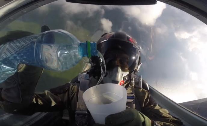 Pilot sipa vodu u čašu dok pravi kolut sa avionom