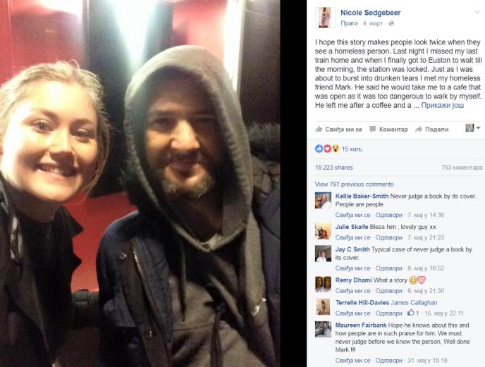 "Baš kad sam htela da zaplačem, pojavio se Mark, beskućnik. Rekao je da će me odvesti u kafić koji je otvoren i da je opasno da po noći hodam sama. Pošto smo popili kafu i malo porazgovarali, ostavio me u kafiću i objasnio mi da mora da ode do svoje vreće za spavanje, ali da će doći u 5 ujutro po mene da me otprati na stanicu. Ja sam bila tipična kučka i nisam verovala da će se vratiti. Prošlo je 5, a njega nije bilo. Kad sam krenula, Mark je trčao ulicom prema meni. Ne samo da je došao, nego je i morao ići autobusom po mene. Tog čoveka verovatno ne bih pogledala u oči da mi je tražio novac, ali ovaj događaj mi je potpuno otvorilo oči. Mark, ti si poseban čovek, nikada više neću gledati sa visine na beskućnike", napisala je Nikol na Fejsbuku.