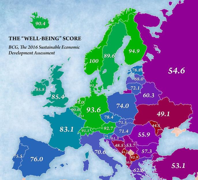 Češki lingvističar, matematičar i umetnik Jakub Marian napravio je mapu u kojoj je ocenjeno blagostanje i zemljama Evrope. U obzir je uzeo 44 različita indikatora kako bi prikazao koja je zemlja najbolja za život.