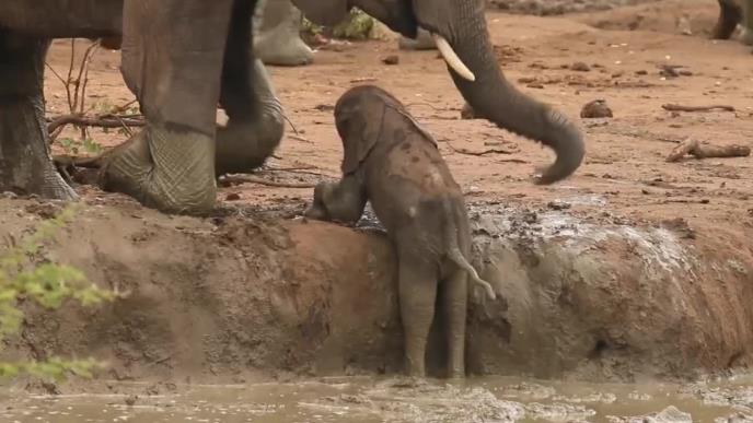 Maleno slonče je imalo poteškoće da se popne bliže svom krdu. Evo šta su ostali slonovi uradili da mu pomognu.