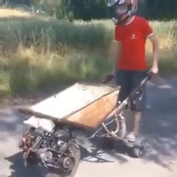 Na snimku je prikazan muškarac sa svojim specijalnim izumom – kolicima na pogon.