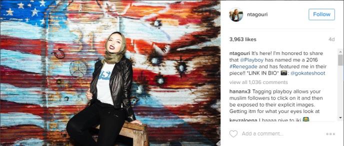 Dvadesetdvogodišnja novinarka Nur Tagouri spojila je naizgled nespojivo, hidžab i Plejboj magazin, jer je pozirala za najpoznatiji muški magazin na svetu obučena u farmerke, kožnu jaknu i patike.