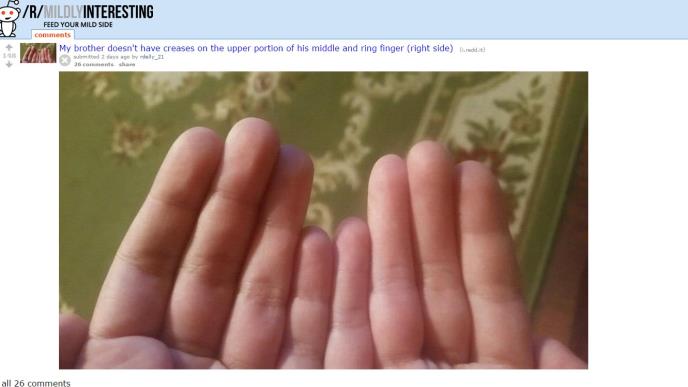 My brother doesn't have creases on the upper portion of his middle and ring finger (right side) from mildlyinteresting