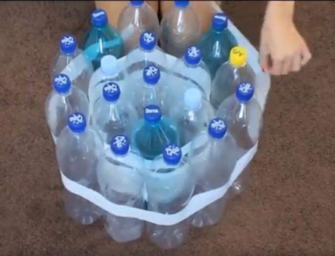 Uzela je nekoliko flaša i zalepila ih selotejpom, zatim je dodala još jedan red flaša koje je takođe zalepila.