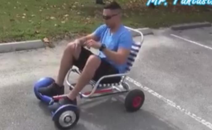 Kako se samo dobro dosetio. Na popularni hoverbord koji je do sada morao da se vozi u stojećem položaju prikačio je stolicu sa točkićima. I to sada izgleda veoma zanimljivo.