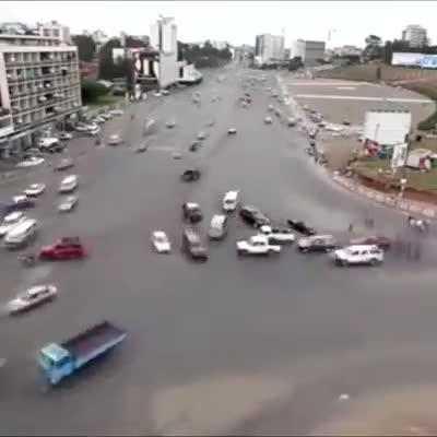 Navodno je snimljen u Africi, u Etiopiji. Gomila automobila prolazi kroz raskrsnicu bez vidljivo obeleženih semafora i signalizacije dok gledaocu bukvalno zastaje dah u iščekivanju nekog sudara. Ali sudara nema. Ono što je takođe interesantno je da raskrsnicu prelaze i pešaci i to u raznim pravcima. Ima dosta komentara na društvenim mrežama čak i onih koji smatraju da bi pre došlo do sudara ako se postave semafori i neka pravila.