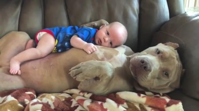 Dečačić po imenu Stoun je još beba, a na snimku se može videti kako leškari na stomaku svog ljubimca, ženki pit bula Bel (Lepotica). Otac dečaka koji inače čuva nekoliko pit bulova okačio je ovaj video kako bi razbio predrasude i podstakao druge roditelje da čuvaju pse ove rase, iako su im deca sasvim mala. Treba imati u vidu da su psi ove rase originalno i stvoreni za čuvanje dece, a ne za borbe.