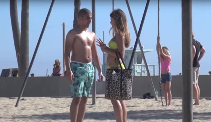 Zgodna devojka je u bikiniju šetala plažom, i prilazila momcima koji su uglavnom bili u grupi.