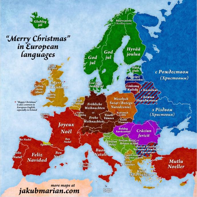 Za sve one koji danas proslavljaju ovaj praznik, ali i one koji ga žele čestitati prijateljima donosimo posebnu mapu koja prikazuje kako se u kojoj državi Evrope čestita Božić, a koju je napravio portal JakubMarian.