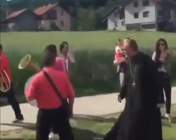 (VIDEO) SKANDALOZNO PONAŠANJE SVEŠTENIKA: Pop ŠUTIRAO i psovao trubače dok su svirali ispred crkve!