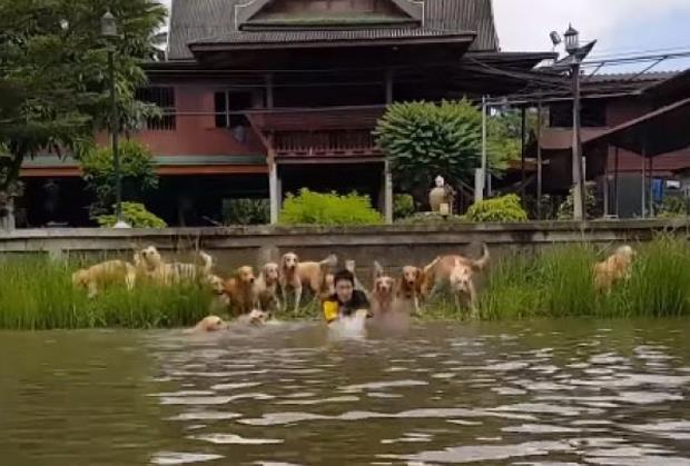 Ovaj snimak pokazuje jedan takav neverovatan prizor. Naime, vlasnik čitavog čopora zlatnih retrivera (tačnije njih 16) je zaplivao, nakon čega su mu se u sekundi pridružili i njegovi ljubimci.
