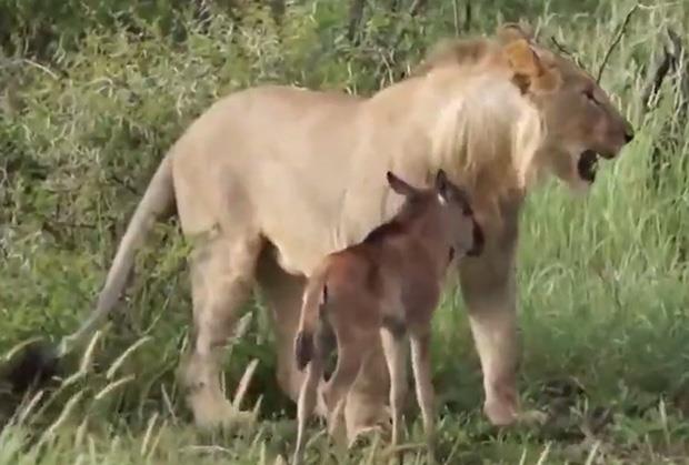 E, pa ne mora da bude! Jedan mladi lav (još mu griva nije porasla) spazio je mladunče gnua i ustremio se na njega. Posle kraće potere uspeo je da ga uhvati i kada očekujete da ga rastrgne, on počinje da se igra i mazi sa njim. Štaviše, uskoro je naišla lavica koja je želela njegov plen, ali lav nije želeo da joj da svog drugara.