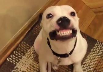 Kao da to zna i ovaj stratfordski terijer, pa je utrenirao da na komandu "čiz" (iliti što kod nas bila "ptičica"), on zauzima poseban položaj i osmeh od uva do uva.
