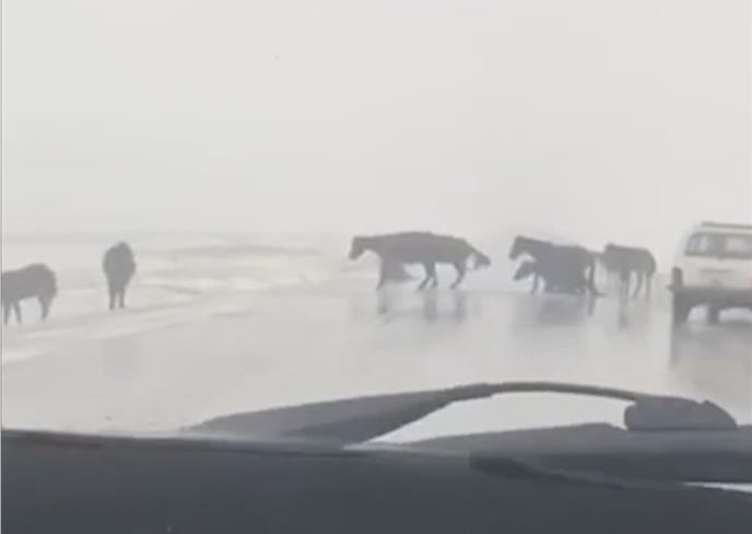 Krdo divljih konja je pokušala da pređe preko zaleđenog regionalnog puta. I pokazala da i oni umeju da se klizaju.