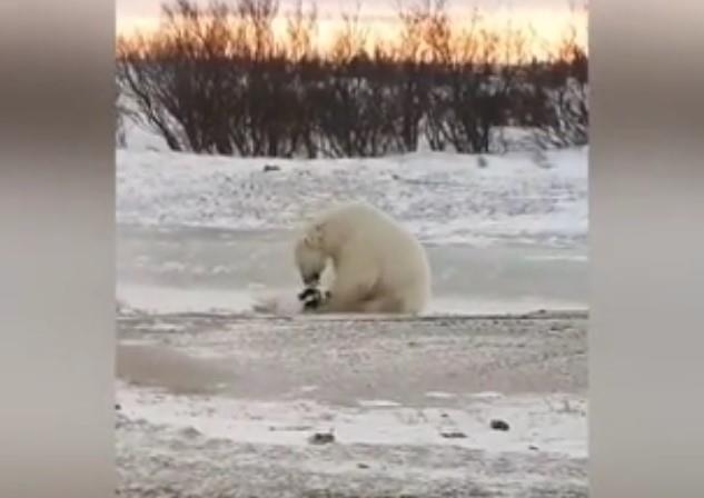 Situacije gde gladni polarni medved siđe među ljude, pa napadne njih ili domaće životinje nisu nepoznate u Kanadi. Tako i situacija koju su zabeležili foto-reporteri u Manitobi, gde je medvedica naišla na vezanog psa, nije obećavala dobar rasplet za ovog drugog.