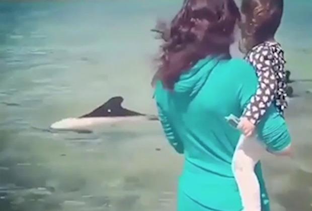Donosimo vam sliku nesvakidašnjeg prizora. Majka sa devojčicom u naručju, stoji u plićaku mora, a oko nje pliva mnoštvo delfina.