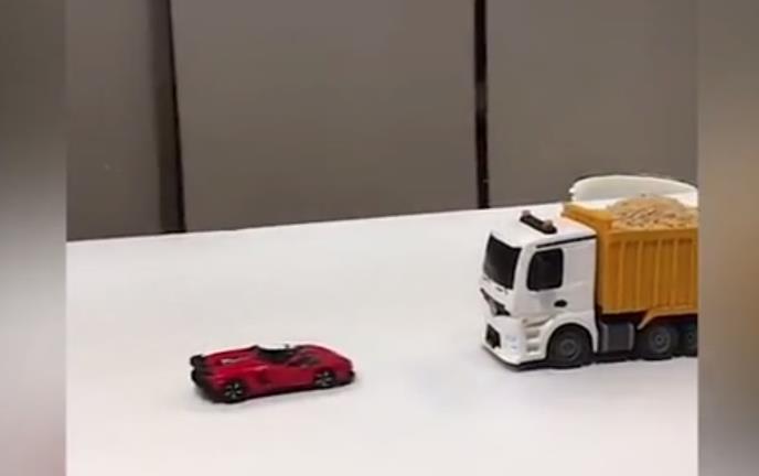 Ovaj kamion zaista izgleda kao primamljiva i skupa igračka: kreće se na baterije, ima svetla, točkovi mu se pomeraju levo-desno, nosi čak i tovar u prikolici.