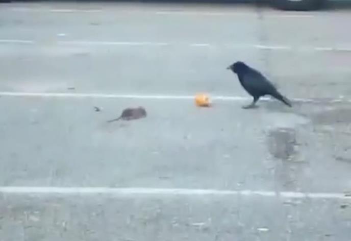 Ova vrana je u potrazi za hranom pronašla parče hleba. Međutim, dogodilo se da ga je ugledao i jedan miš.