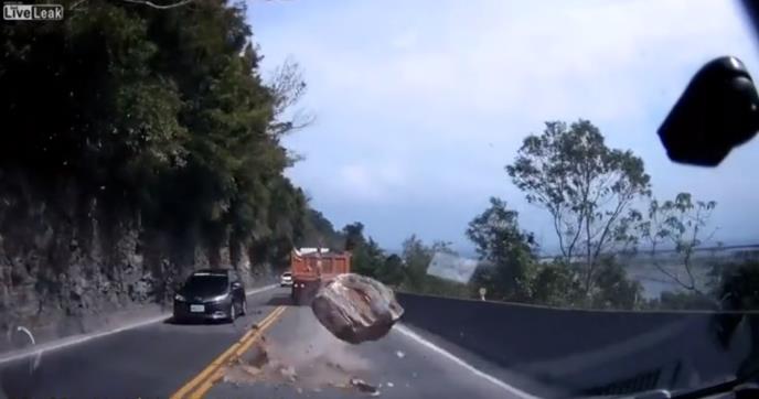 A, evo o čemu se radi. Kada je vozio jednim planinskim putem potpuno neočekivano pred njega se sručila ogromna stena. Nije imao vremena da zakoči, ali ona je, srećom, samo odskočila i odletela nizbrdo.