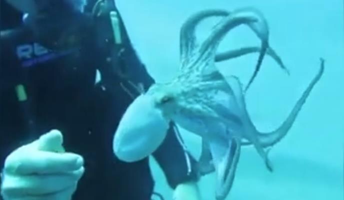 Ali ovaj ronilac je verovali ili ne, naišao na hobotnicu koja se mazi i umiljava, poput prave domaće životinje.
