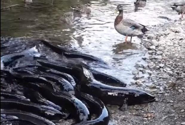 Ako niste videli kako izgleda vodena površina puna jegulja, evo prilike da vidite taj koloplet ljigavih telesa koja se tiskaju jedna preko drugih.