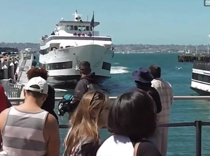 Brod pristaje u luku, ali ne usporava. Ljudi okupljeni na doku u San Dijegu isprva misle da je situacija pod kontrolom.