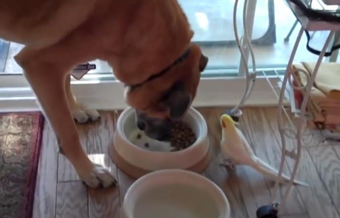 Ova preslatka ptičica, je tako umilno pevala psu na uvo dok je jeo svoju omiljenu hranu za ručak.