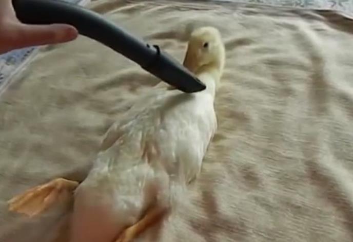 Tako na primer ova patka uživa da je vlasnik miluje papučicom od uključenog usisivača. Dobro ste razumeli. Dok se većina životinja plaši ovog kućnog aparata, zbog koga ni jedna kuća ne može normalno da funkcioniše, ova patka uživa u njegovom zvuku. A još veće iznenađenje je što voli da je gazda miluje papučicom od usisisivača.