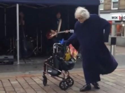 Jedna bakica, koja se kreće uz pomoć invalidskih kolica, svratila je na muzički festival u grad Pejsli. Baš tada nastupao je bend Bedbojs, koji svira obrade AC/DC, a "prašili" su čuveni hit "Hajvej tu hel". Starica se pridigla iz kolica i započela pravi šou na trgu. Đuskala je, klatila se i pljeskala, a okupljeni su je za nastup nagradili ovacijama.