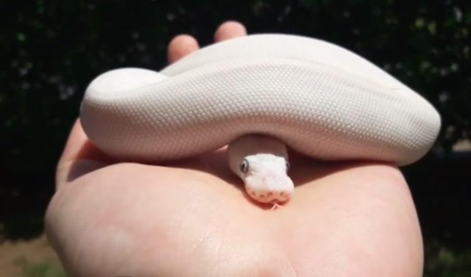 Na ovom snimku videćete loptastog pitona, kojeg čovek opušteno drži u ruci. Međutim kada mu vidite boju očiju oduševićete se.