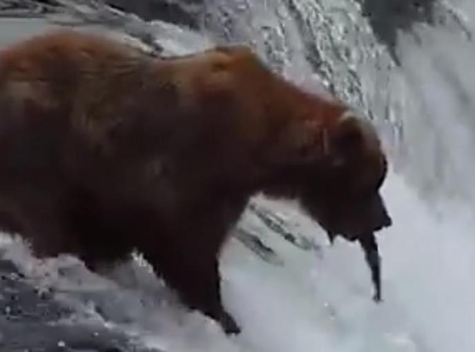MEDA STOJI NA VRHU VODOPADA I LOVI RIBE: Verujte nam nikakva posebna tehnika mu nije potrebna, one mu same USKAČU U USTA! (VIDEO)