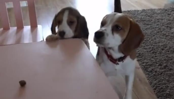 Kada su vlasnici dva bigla, psa Čarlija i šteneta Lili, ostavili pseći slatkiš na stolu, kučence se iz petnih žila trudilo da ga dohvati.