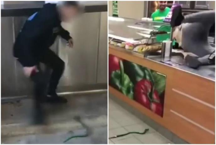 Tako nešto se dešava na ovom snimku, koji je, zapravo, podvala momka koji zmiju igračku na uzici lepi prolaznicima na leđa, a zatim ih, kao, upozorava na opasnost.