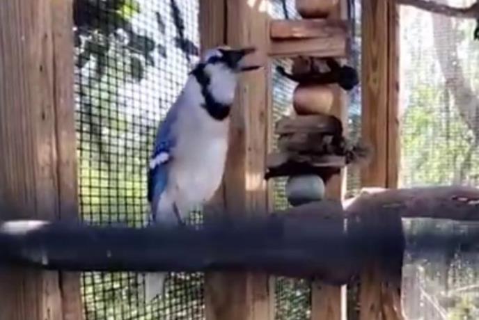 Kažu da se strani jezici najbolje "upijaju" od malih nogu. Ideal primer za to je plava šojka po imenu Flop, koja je odrasla sa mačkama.