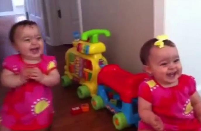 Koliko je potrebno za smeh? Veoma malo, pokazuje slučaj jednogodišnjih bliznakinja koje se zacene od kikotanja svaki put kada njihov pas izvede trik i zgrabi zalogaj.