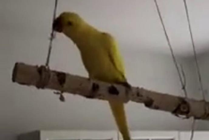 Jedan od njih je ovaj žućko koji je uporno grickao kanap koji drži ljuljašku. Malo po malo, on ga je toliko protanjio da konopac više nije mogao da izdrži težinu ptice. Šta se dogodilo - možete da pretpostavite.