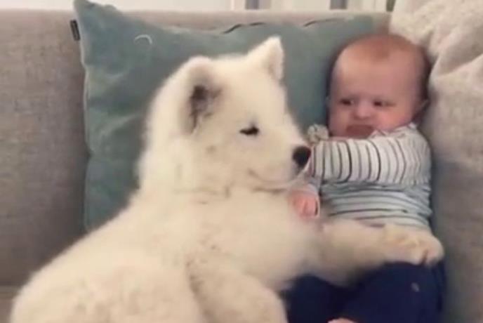 Svi oni koji imaju kućne ljubimce znaju koliko je lepo i korisno kada deca odrastaju uz njih. Na snimku koji objavljujemo imamo još bolju situaciju - dve bebe, ljudsku i pseću, koje će da stasavaju u tandemu.